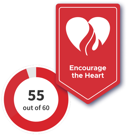 Woman high fiving her coworkers, with a 55 out of 60 scale and a red ‘Encourage the Heart’ leadership behavior banner are in the bottom right corner.